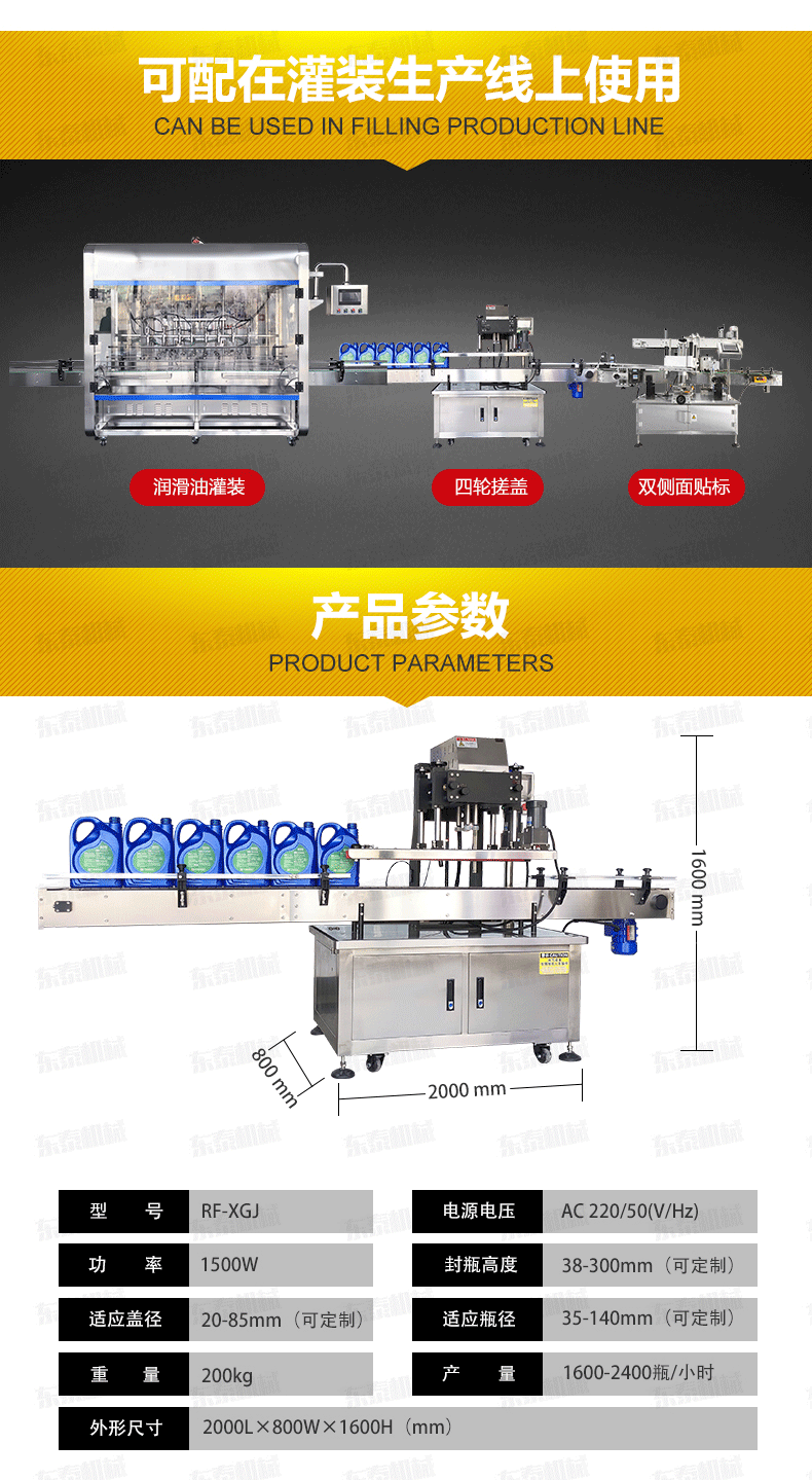 瓶、傳送、旋蓋,機(jī)器自動(dòng)化程度高,穩(wěn)定性好,調(diào)節(jié)方便,更換瓶形或蓋時(shí)無(wú)須備件,只需作調(diào)整即可完成(如配上蓋機(jī),可進(jìn)行自動(dòng)上蓋)可以根據(jù)實(shí)際需要選配。