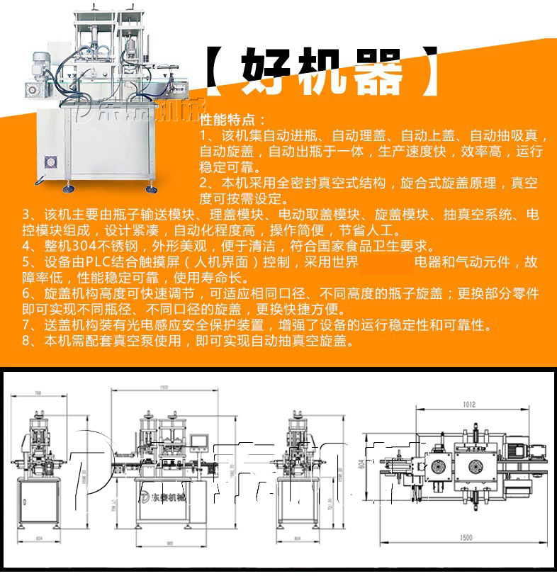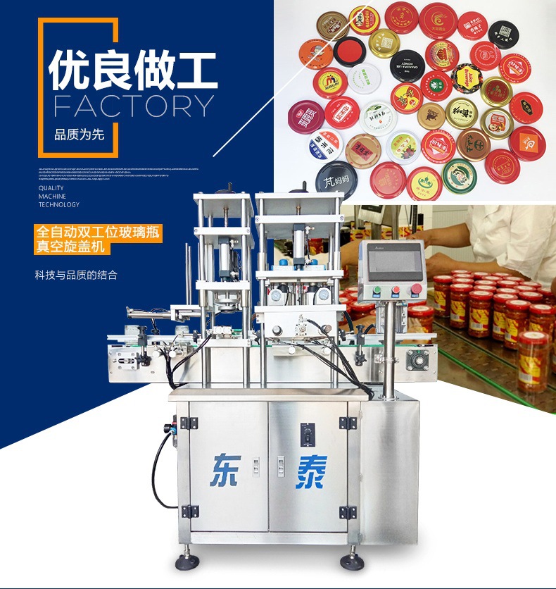 該機(jī)借鑒國(guó)外技術(shù),結(jié)合國(guó)內(nèi)客戶需求研發(fā)而成。該機(jī)集自動(dòng)進(jìn)瓶、自動(dòng)理蓋上蓋、自動(dòng)抽真空旋蓋、自動(dòng)出瓶于一體,生產(chǎn)效率高,運(yùn)行穩(wěn)定可靠,是食品醬料、飲料、保健品等行業(yè)馬口鐵三(四)旋蓋理想的抽真空旋蓋設(shè)備。