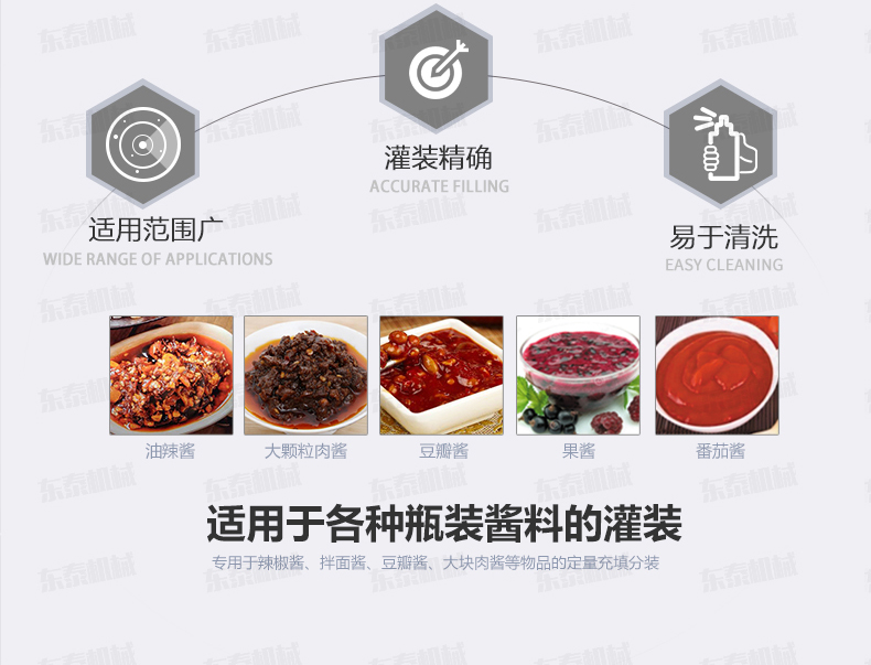 醬料灌裝機(jī)擁有穩(wěn)定性牢靠、機(jī)械自動(dòng)化水平高,相比較同種產(chǎn)品擁有更長(zhǎng)的使用年限,維護(hù)簡(jiǎn)單,整線中各設(shè)施的協(xié)調(diào)性、銜接性強(qiáng),整線設(shè)計(jì)構(gòu)思合理等特點(diǎn)。灌裝設(shè)備運(yùn)用的系統(tǒng)架構(gòu)符合了量產(chǎn)化、集成化加工的要。灌裝設(shè)備在參照類似品的根本上進(jìn)行改善設(shè)設(shè)計(jì)構(gòu)思,醬料防滴防漏灌裝頭在灌裝環(huán)節(jié)中不影響瓶口及瓶體,便于后期的旋蓋和貼標(biāo)步驟。醬料灌裝機(jī)運(yùn)用橫推料的方式,減少了下料斗到灌裝頭的間隔,提高了灌裝速率,更關(guān)鍵的是解決了含油量大的原材料在灌裝環(huán)節(jié)中出現(xiàn)的有的瓶油多,有些瓶醬多的灌裝難.,進(jìn)一步提高了灌裝精確度。